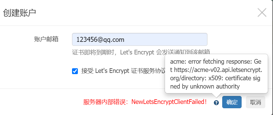 更换域名和证书重新创建证书账号提示:服务器内部错误:NewLetsEncryptClientFailed!