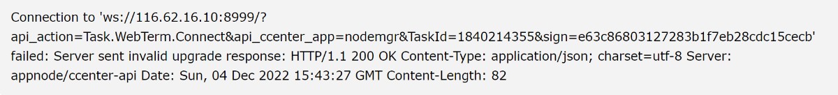 1、使用 http://apidoc.cn/appnode/ccenter-app-nodemgr#/interface/action/8486586771680683 接口,获得 TaskId 2、再使用以下方式,websocket http://apidoc.cn/appnode/app-taskmgr#/interface/action/7678050713110134 3、报以下错误,是哪个步骤错了吗?