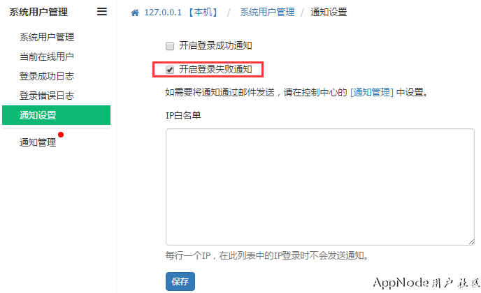 如果您已确保自己的安全措施做得足够,一定要关闭这类通知,可以在【系统用户管理】-【通知设置】中设置,如: