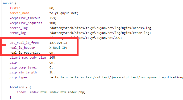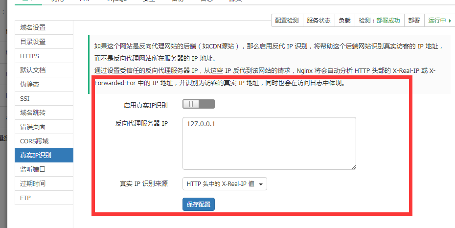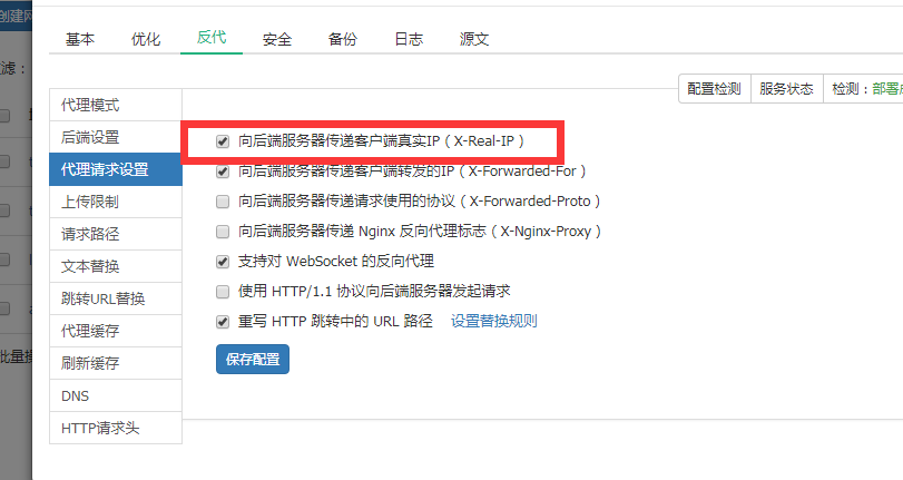 您好, 您需要在两个地方设置,这样才能兼容所有情况. 1 前端站点设置 在前端站点设置-> 反代-> 代理请求设置-> 勾选向后端服务器传递客户端真实ip(默认是勾选的) 2 后端站点设置 在后端站点设置->基本->真实ip识别->把前端服务器ip设置进去. 分别对前后端服务器部署重载后, 即可生效.
